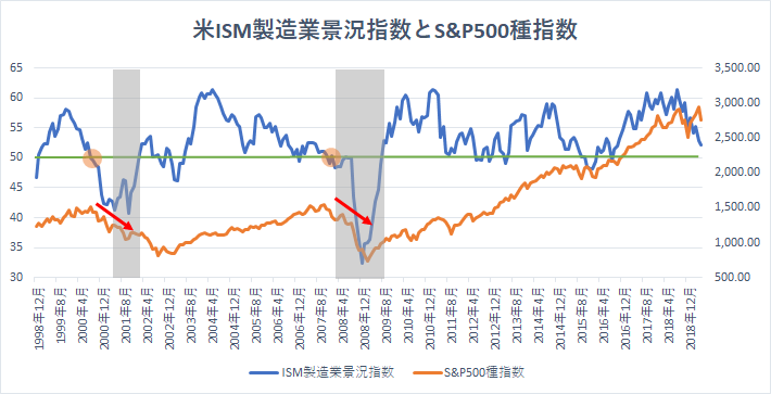 さて、過去30年間を振り返ると、01年と07年のリセッション(景気後退)直前に指数が50を下回っていることがわかります。そのため、18年8月の61.3をピークに一貫して低下傾向が続いていることは注意しておいた方が良いです。