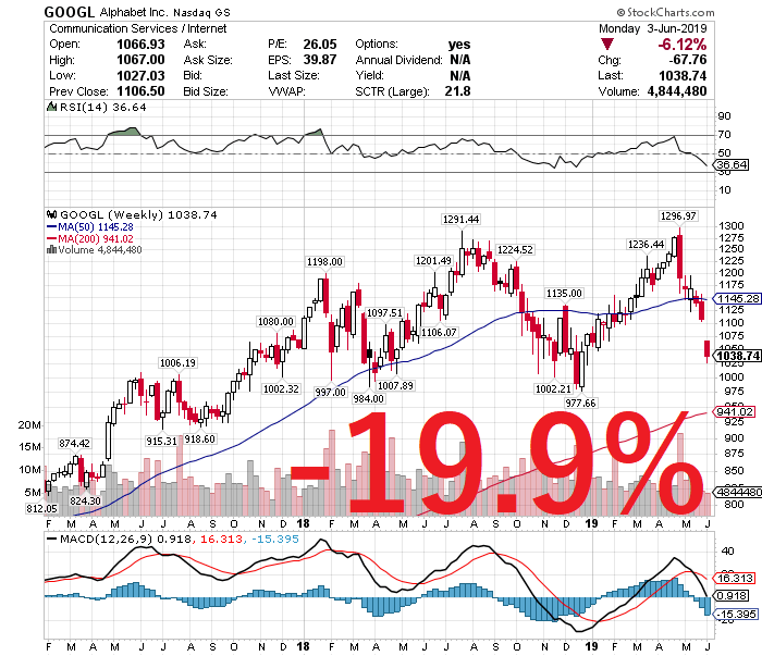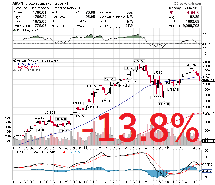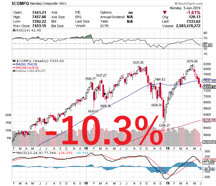 世界経済の成長鈍化や貿易戦争が激しさを増す中、これまでナスダック総合は4月の高値8176.08からズルズルと値下がりしていましたが、この日、ハイテク大手のアルファベット(GOOGL)が6.12%安、アマゾン・ドットコム(AMZN)4.64%安、フェイスブック(FB)7.51%安と急落したことで、さらに下げ幅を拡大させました。
