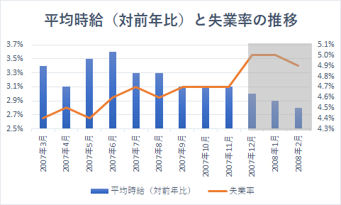 ちなみに、2007年から2008年にかけての平均時給(対前年比)と失業率の推移を眺めると、平均時給の伸び率が減速する中で失業率が上昇し、リセッション入りしました。