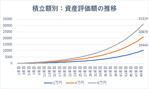 たとえば、年平均利回り7%とした場合、毎月の積立額を2万円とすれば、50年後に1億円の資産を築くことが期待できます。ちなみに、4万円なら2億円、6万円なら3億円です。