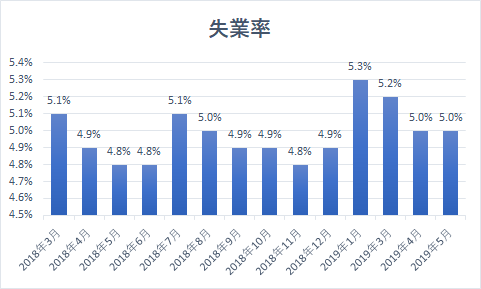 失業率は5%と、前月から横ばいでした。しかし、昨年11月の4.8%からは0.2%ポイント上昇しており、貿易戦争の影響を受けつつあることが示唆されました。