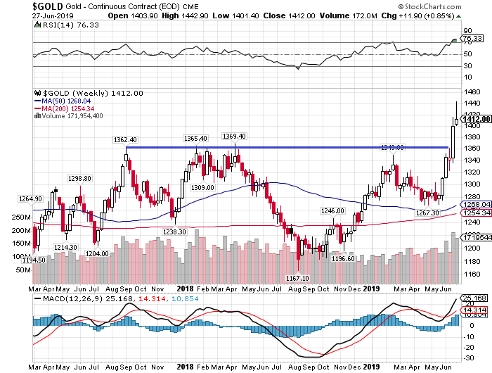 安全資産の代表格である金の先物価格も、これまでレジスタンス(上値抵抗線)だった1360ドルを上に大きくブレイクアウトし、「買い」のシグナルが出ています。