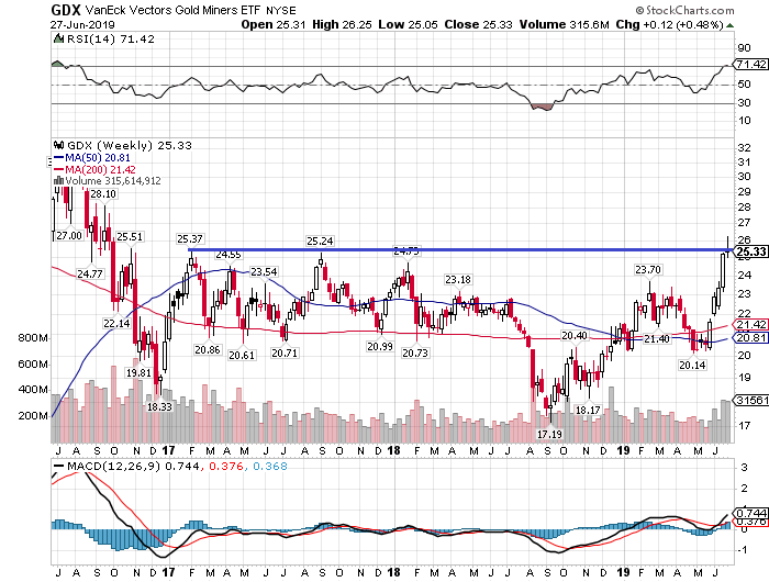 金鉱株ETFは17年の高値をトライしています。これを上にブレイクアウトできるかどうかが注目されています。