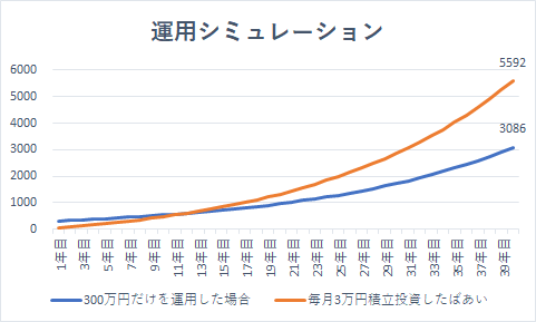 たとえば、手元の300万円を年平均6%で40年間運用した場合、当初の300万円は10倍の約3100万円になりますが、手元資金がゼロでも毎月3万円をコツコツと積立投資して、同じく年平均6%で運用すれば、資産評価額は13年目で逆転し、40年目でおよそ二倍もの差が生じます。
