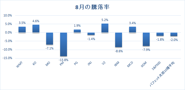 8月の騰落率はS&P500種指数が-1.8%に対して、バフェット太郎10種は-2.0%と市場平均を0.2%ポイント下回りました。