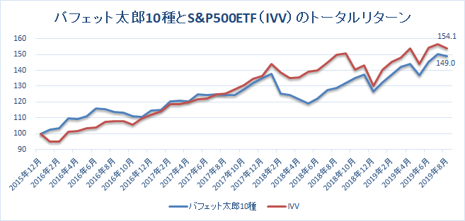 2015年末~2019年8月末までのバフェット太郎10種とS&P500ETF(IVV)の配当再投資を含めたトータルリターンは以下の通りでした。