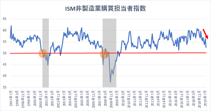 ISM非製造業購買担当者指数は18年9月の61.6をピークに一貫して下落が続いており、徐々に景気拡大と縮小の分かれ目である50に接近しています。
