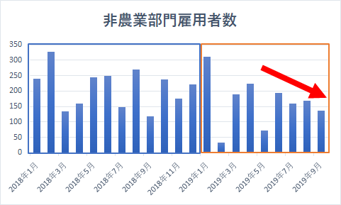 また、業種別では製造業と小売業がそれぞれ2000人減、1万1400人減と不調でした。これは世界経済の成長鈍化と米中貿易戦争の激化による打撃を受けていると考えられ、今後も雇用が伸び悩むことが予想されます。
