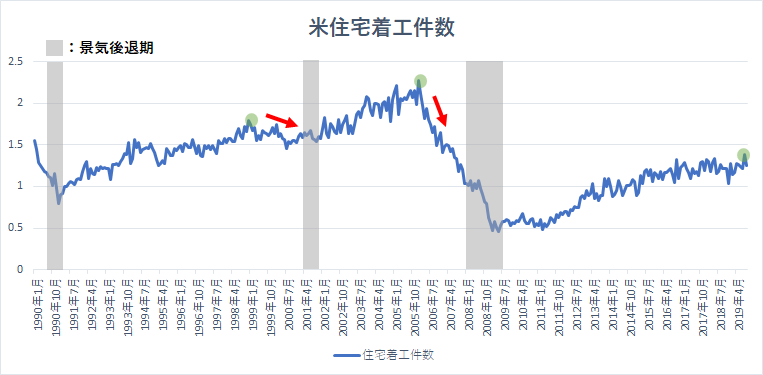 過去二回のリセッションを振り返ると、住宅着工件数がピークを打ってから23~27カ月後にリセッション入りしていることがわかります。