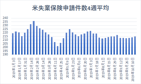 【米失業保険申請件数の4週平均(2019)】