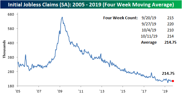 【米失業保険申請件数の4週平均(2005-2019)】