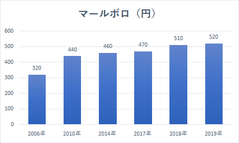 事実、日本では「マールボロ」が現在ひと箱520円と、2006年の320円から、62.5%も値上がりしています。