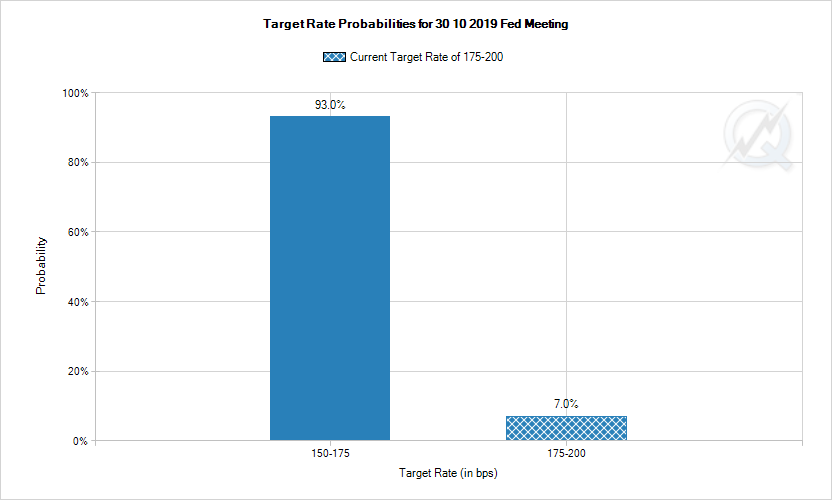 CMEフェドウォッチによれば、市場参加者が予想する10月のFOMC(連邦公開市場委員会)で利下げが実施される確率は93.0%とほぼ確実視されています。これは世界経済の鈍化に歯止めがかからないことや米中貿易戦争に収束の兆しが見えないことが理由です。