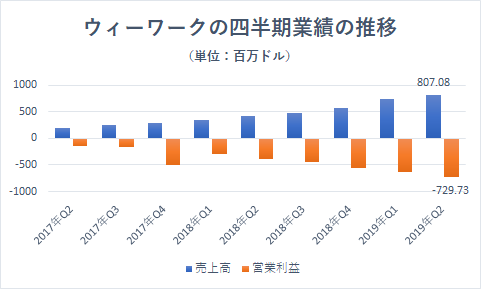 ウィーワークの四半期業績の推移を眺めると、売上高の増加に伴い営業赤字も増えていることがわかります。