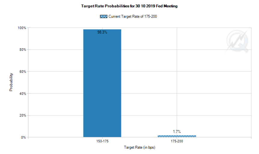 CMEフェドウォッチによれば、市場が予想する利下げ確率は98.3%と、利下げがほぼ確実視されている一方で、一年後(20年11月5日)のFOMCでの予想FFレートは1.50-1.75%が39.1%、1.25-1.50%が39.6%であることから、今回を最後に利下げは打ち止めとなるだろうと見られています。
