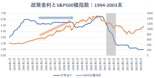 【政策金利とS&P500種指数:1994-2003末】