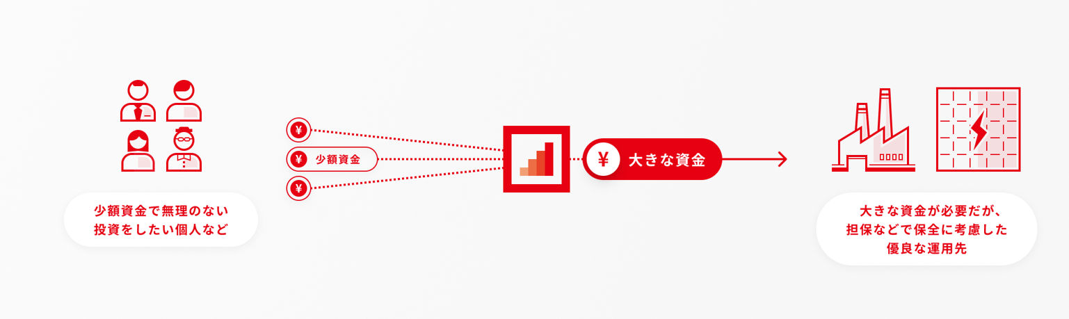 しかし、個人投資家が少額の資金を出し合えば、多額の資金を必要とする投資先でも無借金で投資をすることができます。また、少額から投資をすることが可能なので、投資先を分散することができます。