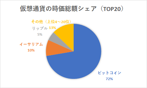 仮想通貨の時価総額シェアTOP20を眺めると、全体の7割をビットコインが占めており、イーサリアムとリップルを含めれば三通貨で全体のおよそ9割を占めています。