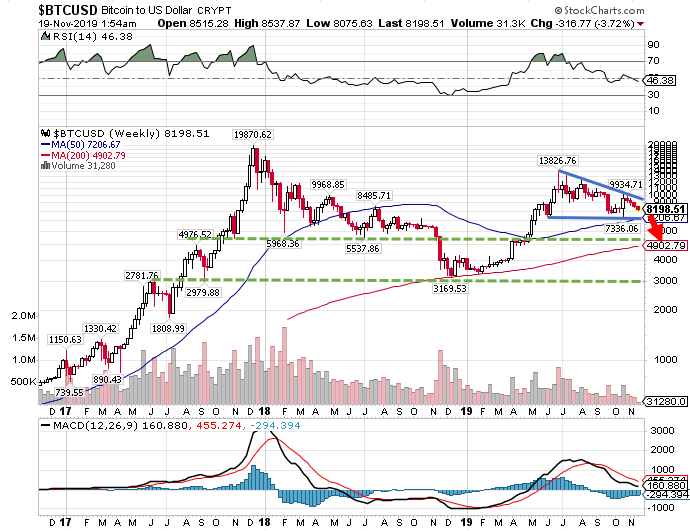 チャートを眺めると、ビットコインは弱気の三角保ち合いを形成しつつあり、7336ドル水準を割り込めば再度5000ドル割れを試す展開が予想されます。さらにそれを割り込めば、2018年の安値3169ドルがターゲットになります。