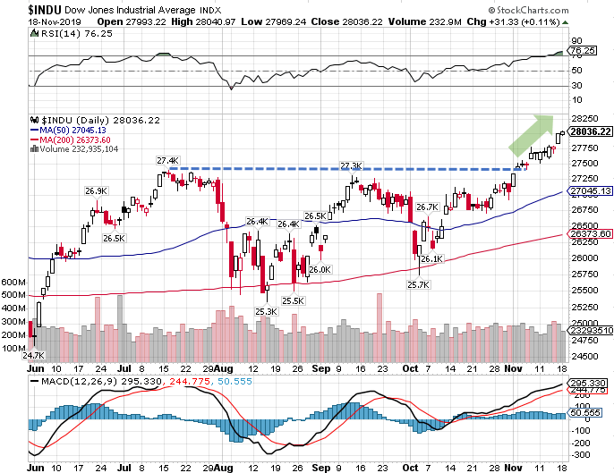 まず、NYダウ株式市場は前日比+31.33ドル(+0.11%)高の2万8036.22ドルと上昇し、史上最高値を更新しました。上昇した主な要因は、トランプ政権がファーウェイ禁輸猶予期間を90日間延長したことが好感されたためです。