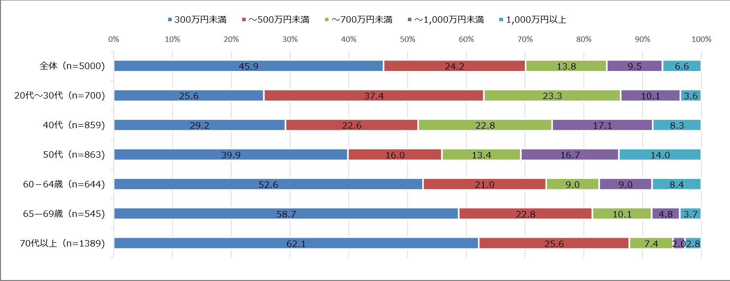 また、「300万円未満」の割合は20代~30代よりも40代の方が、40代よりも50代の方が、そして50代よりも60代の方が多くなるなど、低所得者層の割合が年代が上がるにつれ拡大する傾向があることがわかりました。