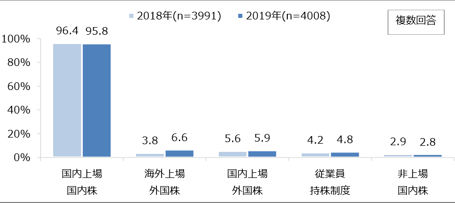 また、株式を保有している人の多くが日本株に投資している一方、米国株などの「海外上場外国株」を保有している人の割合はわずか6.6%しかいません。
