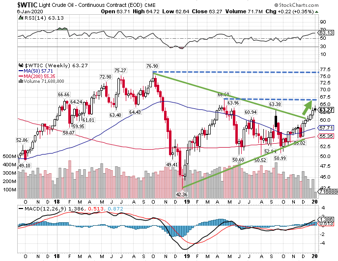 原油先物価格の種足チャートを眺めると、三角保ち合いを形成後、上にブレイクアウトしたことが確認できます。目先のターゲットは19年の高値66.6ドル、その先は18年の高値76.9ドルです。