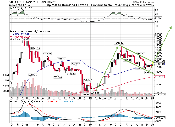 ビットコインの週足チャートを眺めると、下降フラッグを形成していることがわかります。しかし、米国とイランの対立激化を受けて安全資産としての価値が注目され、50週移動平均線を上抜けしたことが確認できます。