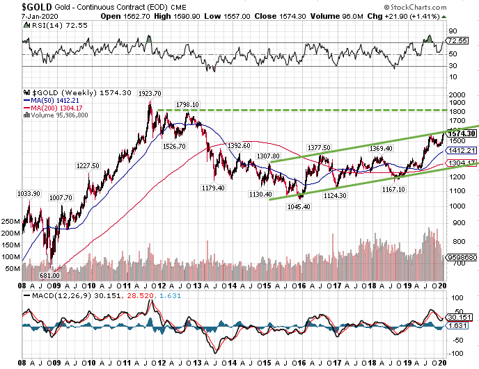 金先物価格の週足チャートを眺めると、強気のトレンドチャネルのレジスタンス(上値抵抗線)に達していることがわかります。ここを上にブレイクアウトすれば一段と上昇する可能性が高まり、2012年の高値1798.10ドルがターゲットになります。