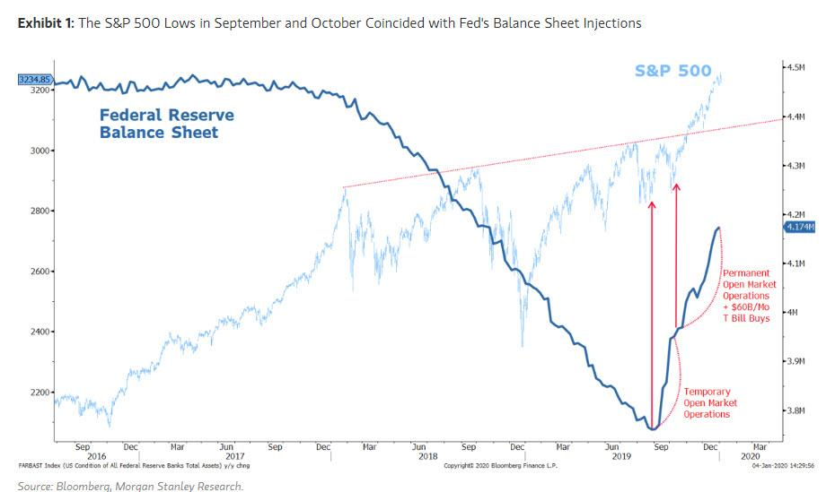 2018年にFRBがバランスシートの縮小を始めると、S&P500種指数は二度の大きな調整局面を迎え、2019年もギクシャクした展開が続きました。そこで、2019年9月にFRBがバランスシートの拡大に転じると、株価は再び上昇基調を取り戻し、米主要三指数はともに史上最高値を更新することができました。