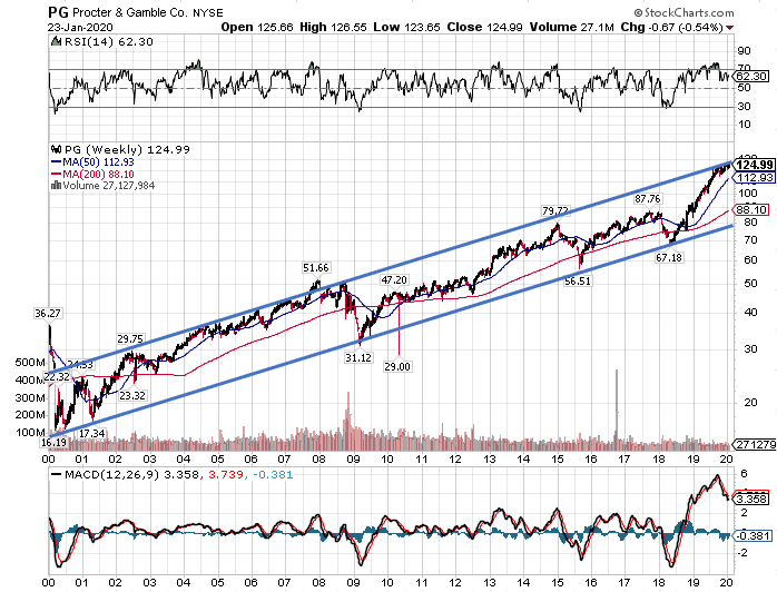 プロクター&ギャンブルの20年チャートを眺めると、上昇トレンドチャネルのレジスタンス(上値抵抗線)に到達していることがわかります。