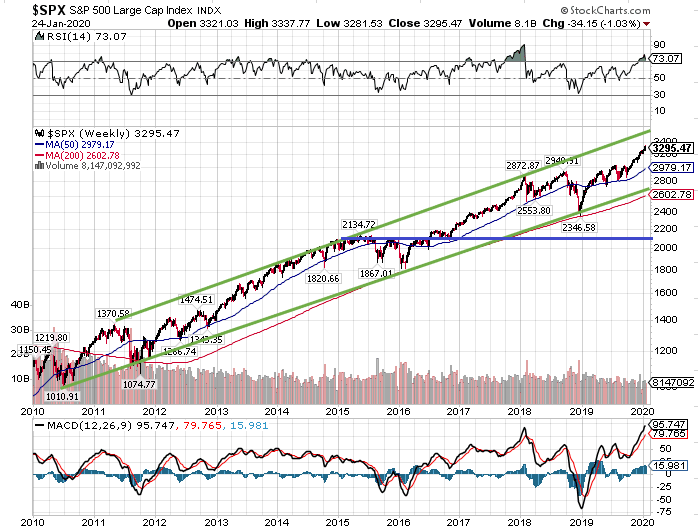 S&P500種指数の10年チャートを眺めると、強気のトレンドチャネルを形成していることがわかります。レジスタンス(上値抵抗線)が3600ポイントを示していることから、そこをターゲットに上昇する公算が大きいです。