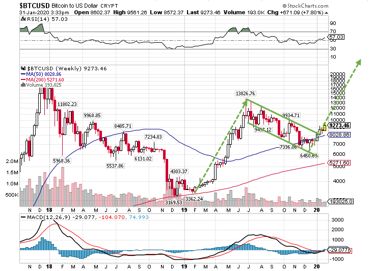 次世代の安全資産として期待されているデジタル・ゴールドのビットコインは、上昇フラッグを上にブレイクアウトしたことから大きく上昇することが期待できます。上昇フラッグは旗棒の長さと同じ分だけ上昇することが期待できますから、2万ドルの大台突破が期待されます。