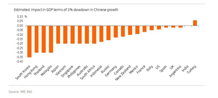 【中国GDP成長率が1%鈍化した場合に各国に与える影響】