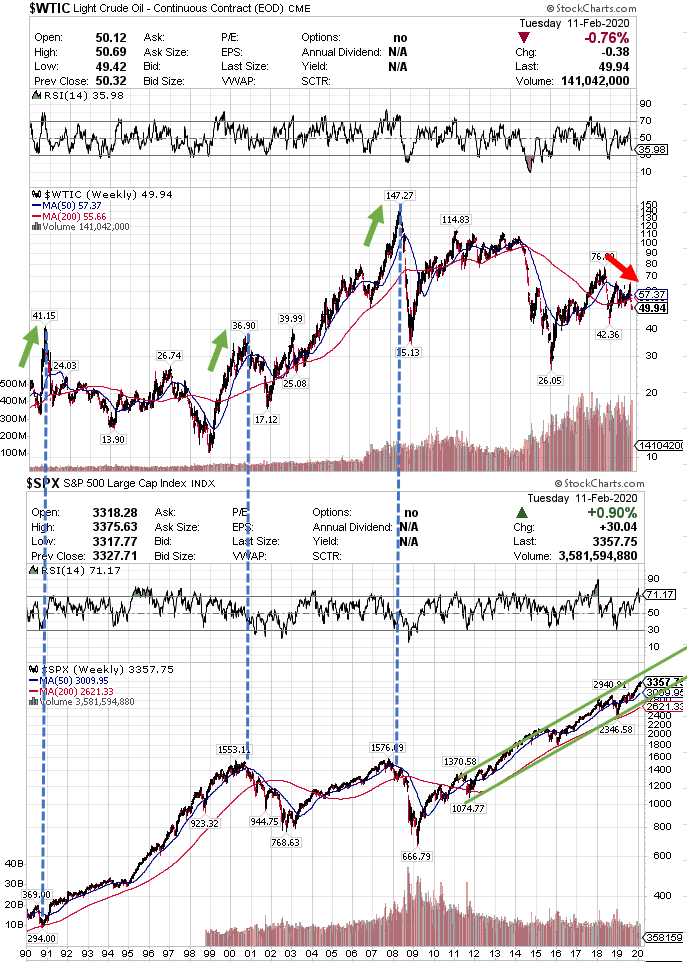 【原油先物価格とS&P500種指数の推移:1990-2020】