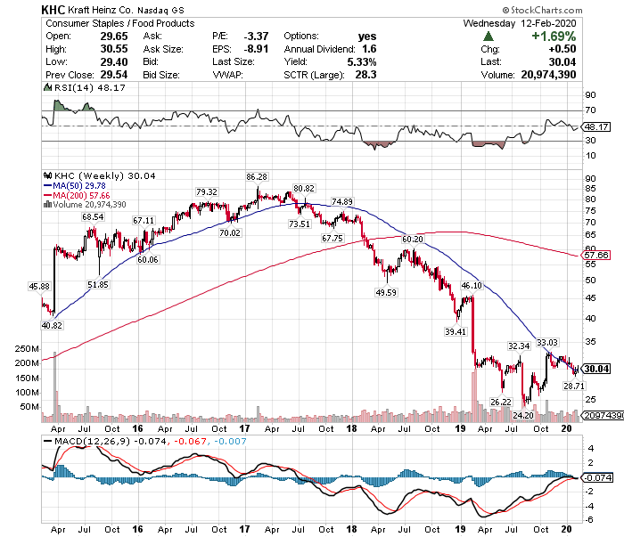 米食品大手クラフト・ハインツ(KHC)は減配や不正会計、そして一部のブランドで多額の減損損失を計上したことを背景に、株価は17年の86.28ドルをピークに一時24.20ドルと-72%も値下がりしました。