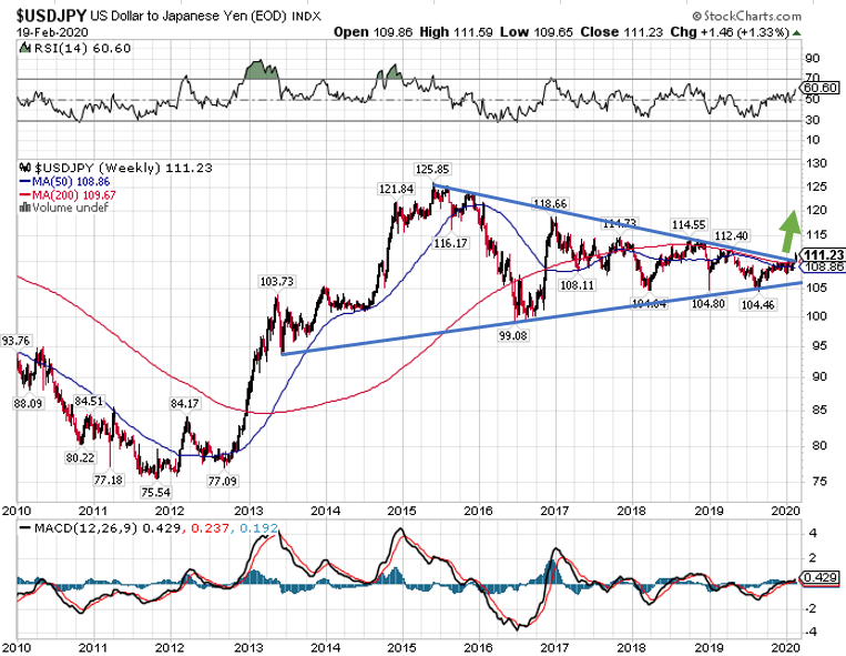 さて、過去10年のドル円チャートを眺めると、三角保ち合いを形成後、上にブレイクアウトしたことが確認できます。