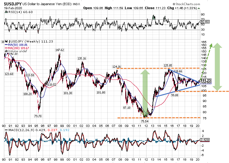 ちなみに、チャートは上昇ペナントを形成していたため、数年かけて1ドル160円をターゲットに大暴騰することが予想されます。