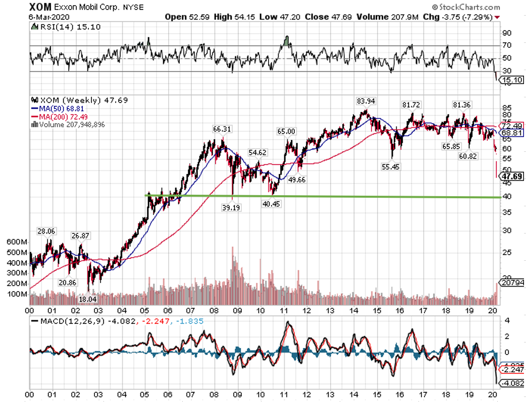 ちなみに、バフェット太郎が保有するエネルギー株、エクソン・モービル(XOM)の株価は47.69ドルと、2010年以来10年ぶりの安値をつけています。株価はこれまでのトレンドラインを割り込んだことで、40ドルのサポートライン(下値支持線)をターゲットに下落する公算が大きいです。
