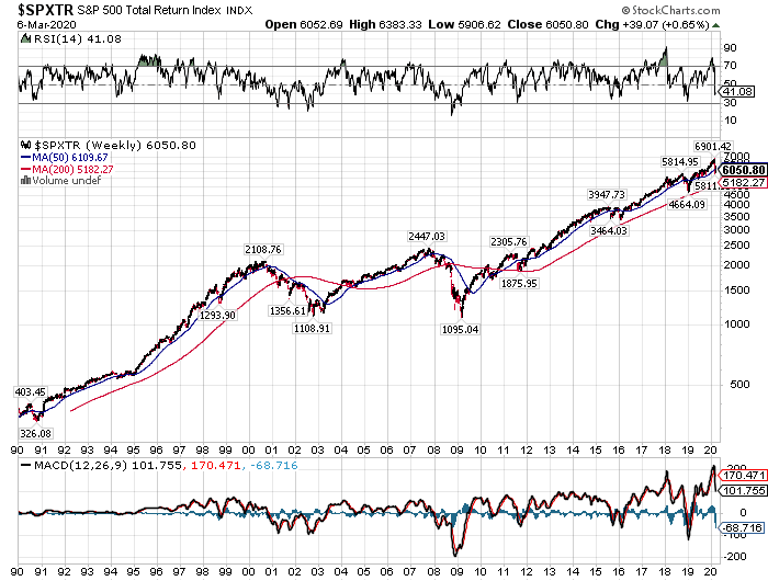 チャートは1989年末から2020年現在までのおよそ30年間に渡るS&P500種指数のトータルリターンの推移を表しています。ちなみに、トータルリターンというのは、配当再投資を含めたリターンという意味です。