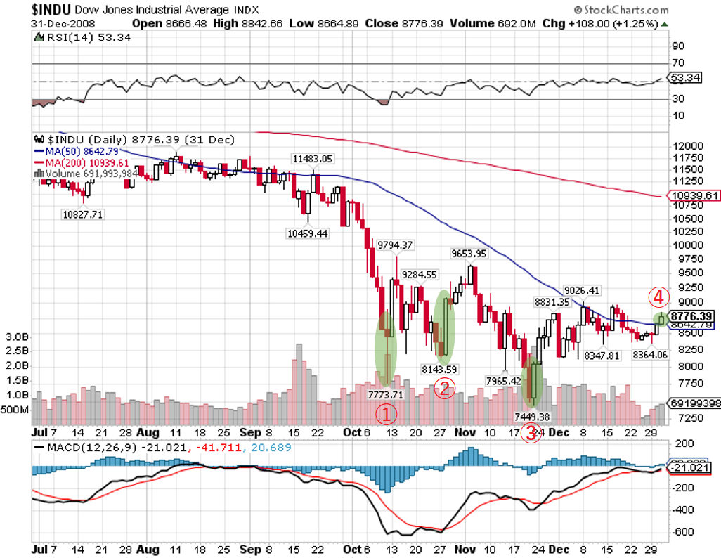 たとえば、2008年の金融危機を振り返ると、10月上旬、ダウは➀の7773ドルで下ヒゲが出現し、出来高も大きく伸びたことで底打ちのシグナルが出ました。その後➁の8143ドルで二番底を形成したことで反転の兆しが見えました。