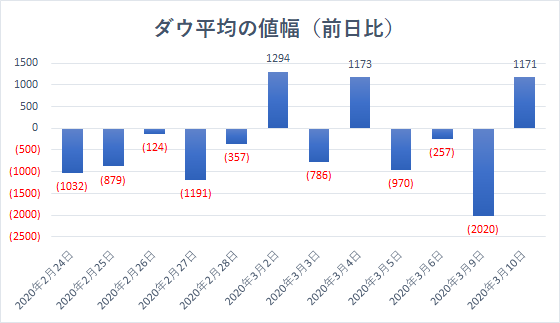 さて、過去12営業日を振り返ると、ダウ平均は大きく乱高下しており、値幅が前日比で1000ドルを超える日が6日もありました。つまり二日に一度は1000ドルを超える値動きをしているわけです。