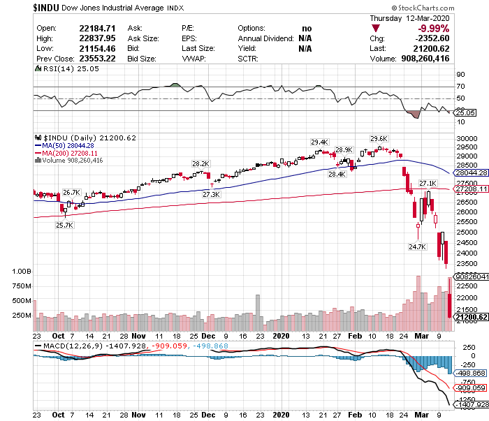新型コロナウイルスのパンデミック(世界的大流行)が、世界経済に大きな打撃を与えるとの懸念が高まったことで、ダウ平均は前日比2352.60ドル(9.99%)安の2万1200.62ドルと、「ブラック・マンデー(1987)」以来の下落率を記録しました。