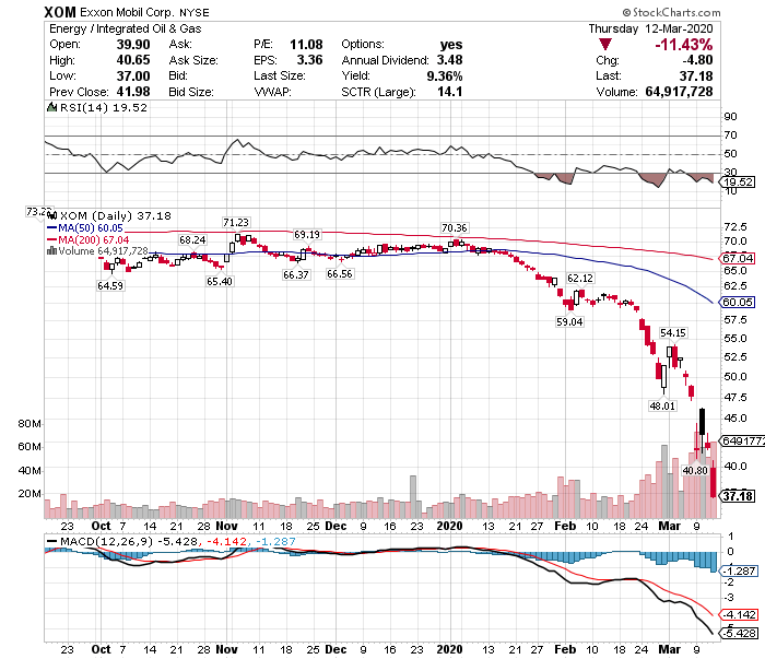 また、米石油メジャー最大手のエクソン・モービル(XOM)も直近の高値から47.2%暴落し、配当利回りは9.36%に達しています