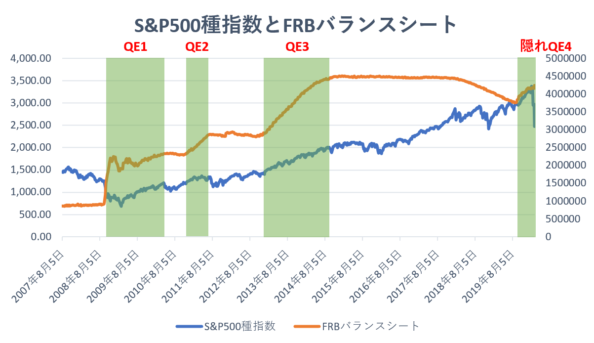 そして、2009年3月以降、QEの効果が本格的に表れ始め、それ以降QEの度に株価が大きく上昇しました。また、2019年10月に隠れQE4(パウエルFRB議長が「今回の措置はQE4ではない」と明言したことでその名称が付いたが、実質的なQE4)が発動されると、再び株価は加速しました。