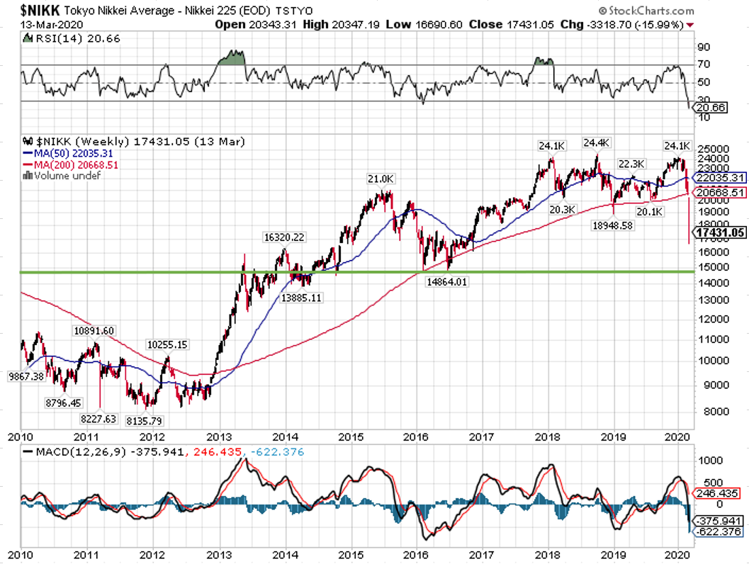 日経平均の10年チャートです。直近の高値から29.5%安と、2016年の下落率29.2%安を上回り、金融危機以降最大の下げ幅を記録しています。