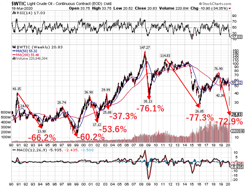 原油先物価格の長期チャートを眺めると、過去30年間で7度の大暴落をしていることがわかります。そして、その下落率は大抵60%以上であったことを考えると、今回、直近の高値から72.9%暴落していることはそれほど驚くに値しないのかもしれません。
