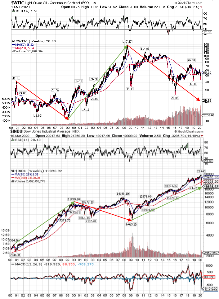 現在、原油価格とダウ平均が大暴落していますが、中・長期的なトレンドで見れば、原油安は米国株にとって追い風であり、原油高は米国株にとって向かい風であることがわかります。