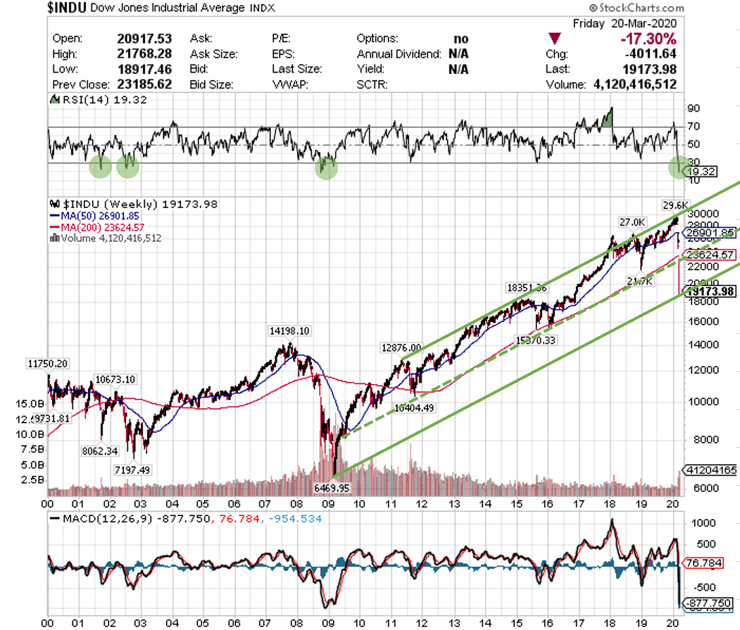 さて、ダウ平均の20年チャートを眺めると、RSIが19.32%と2008年の金融危機以来の水準まで下げていることがわかります。RSIとは相対力指数と呼ばれるテクニカル指標で、相場が「買われすぎ」か「売られすぎ」かを示します。