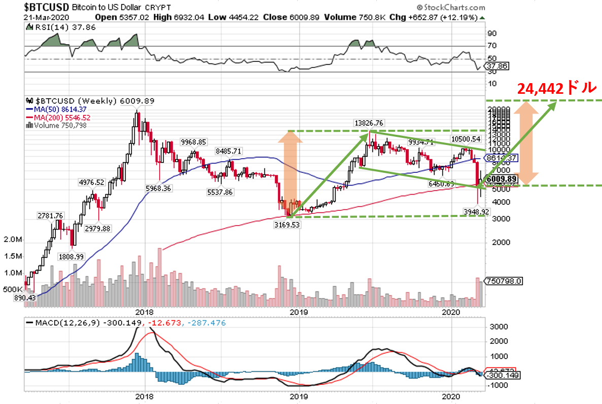 また、チャートパターンは上昇フラッグを形成・維持しているので、今後大暴騰することが期待できます。「上昇フラッグ」とは、旗棒の長さと同じ長さだけ上昇することが期待できるので、ターゲットは2万4442ドルになります。これは現在の価格からおよそ4倍値上がりすることが期待できます。